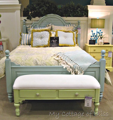 I loved this gorgeous bed in the lime green called “sea grass” (although I think it looks more yellow than green in this photo).